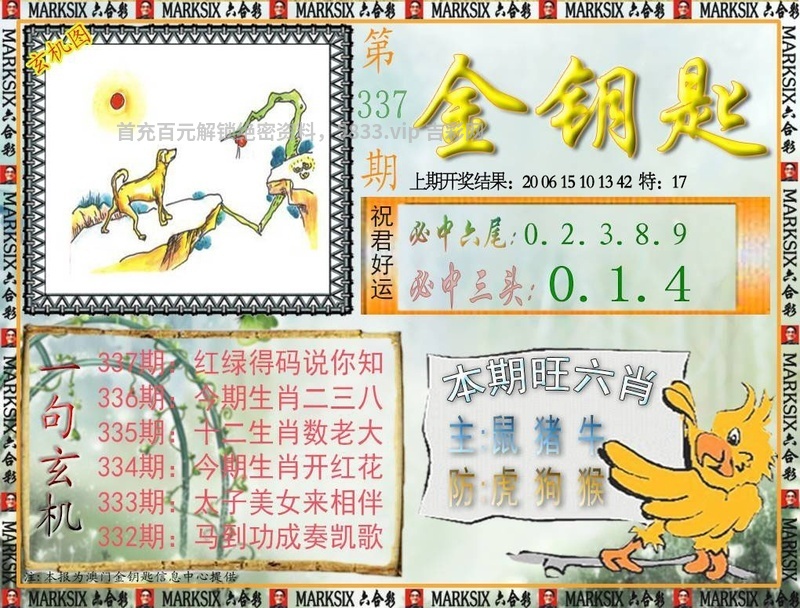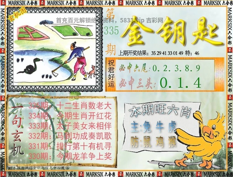335期一字記曰:【厚】 天生优势,快人一步,得天独厚无需做。努力辛勤,成功不到,谁云上天会公道。 玄机测字《愤》 解:谁云上天会公道:上天解天肖猪牛龙猴兔马。 综合两波:红波+绿波 |